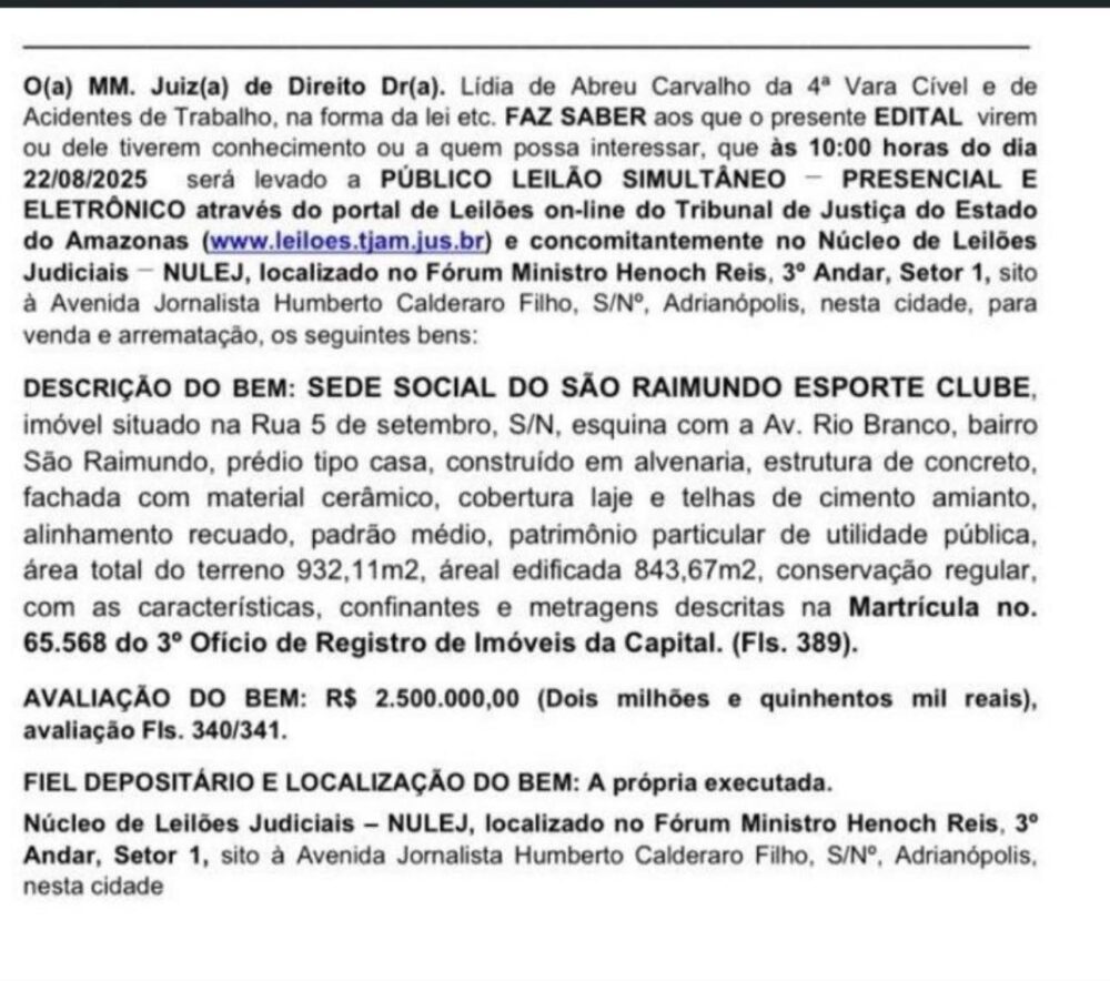 Em relação ao leilão recentemente divulgado, o departamento jurídico do São Raimundo já está tomando todas as medidas cabíveis para a reaplicação da situação junto aos órgãos competentes, buscando preservar o patrimônio do clube e assegurar sua plena recuperação. Lembramos que a dívida é resultado de um empréstimo feito em 2009 pelo então presidente.