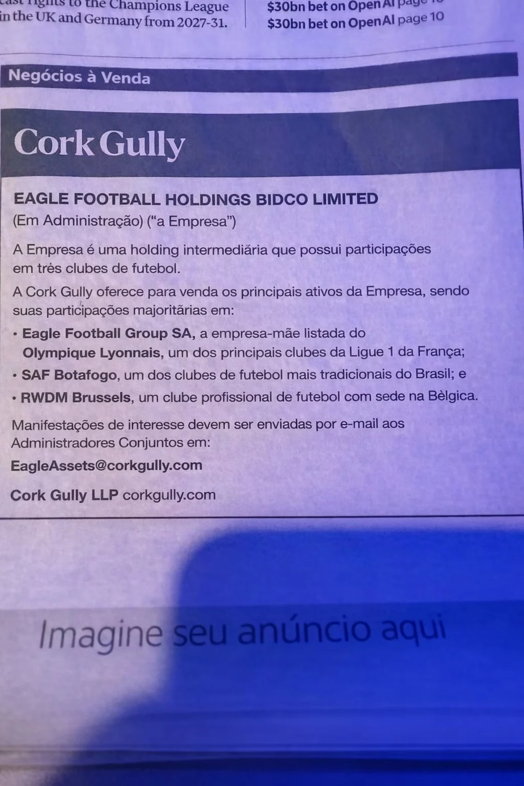 O Botafogo pode passar por uma nova mudança em sua estrutura societária. A SAF do clube foi oficialmente colocada à venda em uma aba de classificados de um jornal britânico, o Financial Times, em iniciativa conduzida pela empresa Cork Gully, atual administradora da holding Eagle Football.